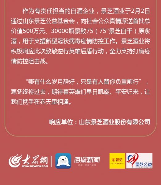 作為有責(zé)任擔(dān)當(dāng)?shù)聂斁讫堫^企業(yè),景芝酒業(yè)第 一時(shí)間響應(yīng),以行動(dòng)“致敬逆行英雄”!
