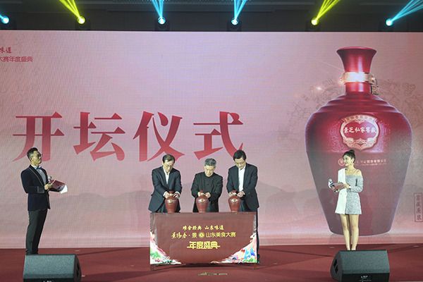 ▲魯菜理論專家、山東省旅游學院原教授趙建民,中國白酒工藝大師、景芝酒業(yè)總經(jīng)理來安貴,中國白酒大師、景芝酒業(yè)常務副總經(jīng)理趙德義為美酒啟壇