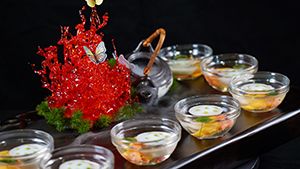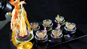 酒鄉(xiāng)錦毛鯉、翻江倒海、荷塘月色、鮑魚紅燒肉......星廚們用自己的技藝和創(chuàng)意匯聚成精美絕倫、寓意豐富的美食藝術品;一道道做工精細、別具匠心的佳肴讓人垂涎欲滴,也難倒了現(xiàn)場評委。